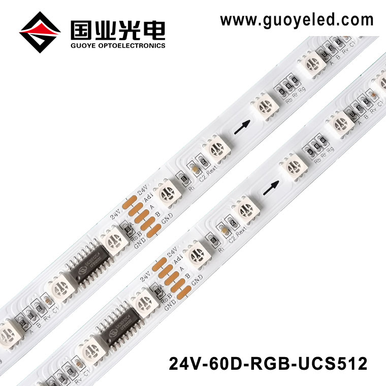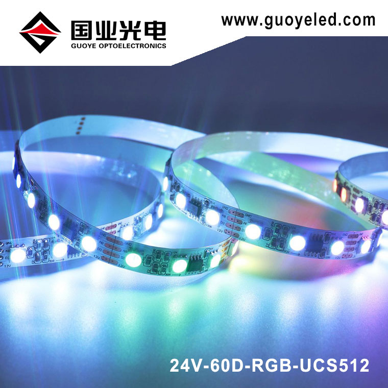 DMX512 led лента со соодветен пет-жичен меѓународен стандарден протокол DMX512, 12mm широка плочка, 256 сиво ниво, 24V постојан напон безбедносен напон, секои 6 RGB led со UCS512 IC формираат јамка, Преку контролорот за постигнување постепена промена, вода, коњски трки, текст, бројки, слики, анимација и други креативни ефекти, програмирање со адреси, протокол за паралелен пренос на двоен сигнал, оштетување на која било точка на пиксели, не влијае на друга работа. Задебелена флексибилна електролитичка бакарна двослојна плочка за коло, со помош на чип SMD со highlight 5050 RGB, има карактеристики на мала потрошувачка на енергија, ниско производство на топлина, без отсјај и отпорност на удар. Долгиот животен век може да достигне 50000 часа