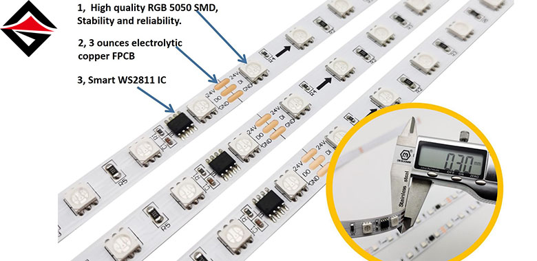 Свитната лента што тече обично користи три основни бои LED ламбички мониста, црвена, зелена и сина боја, што може да измеша различни бои. Моделите со високи производи поддржуваат целосна адреса за независна боја во боја, секоја LED може да постави RGB вредност одделно, прикажувајќи околу 16 милиони бои.